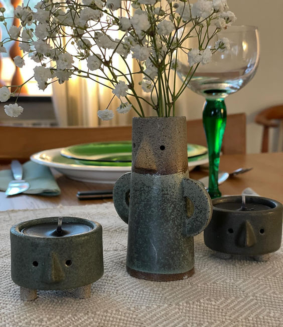 Jag bygger min keramik för hand, varje objekt är unikt. Föremålen och figurerna står för sig själva, men får liv i sällskap av varandra och när de brukas – som vaser, ljushållare eller som förvaring för småsaker och smycken.